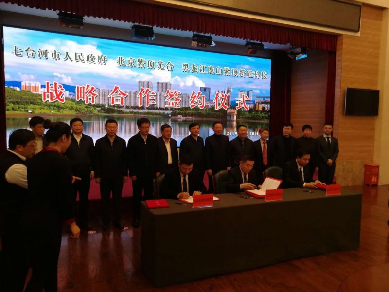2019年1月20日上午,七臺河市人民政府、北京紫頂光合企業管理中心(有限合伙)、黑龍江鹿山紫頂新能科技有限公司簽約儀式在市專家接待中心舉行。市委書記楊廷雙,市委副書記、市長賈君,市委常委、秘書長蔣和慶,市政府副市長王義光,市政府秘書長陳志、鹿山集團鐘金海等領導出席簽約儀式。市委常委、副市長安虎賁主持簽約儀式。